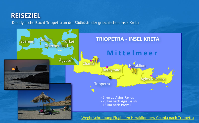Reiseziel ist Triopetra, eine zauberhafte Bucht mit drei Felsen im Meer, an der Südwestküste Kretas – gelegen zwischen der Drachenfelsbucht Agios Pavlos und dem Palmstrand Preveli.